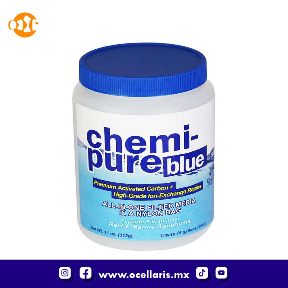 La fórmula patentada de Chemi-pure Blue reduce significativamente los compuestos orgánicos, los olores, los fenoles, las toxinas, los medicamentos, los metales disueltos, los fosfatos y los silicatos. El carbón activado peletizado de alta capacidad de Chemi-pure Blue tiene un contenido de cenizas muy bajo y se enjuaga rápidamente, lo que reduce el potencial de HLLE dentro de su acuario. Chemi-pure Blue utiliza la mejor tecnología de resina de grado de laboratorio para eliminar RÁPIDAMENTE compuestos orgánicos y fosfatos del agua de su acuario mientras aumenta el redox y ayuda a estabilizar el pH. Chemi-pure Blue dura más que los medios filtrantes promedio y reduce la necesidad de cambios frecuentes de agua. La fórmula única de Chemi-pure Blue es el mejor medio de filtración para acuarios marinos disponible para un acuario marino saludable, estable y cristalino. Chemi-pure Blue es un medio de filtración revolucionario que está diseñado para adsorber moléculas orgánicas nitrogenadas, junto con fosfatos y, en cierta medida, incluso nitratos mucho más rápido, más eficiente y durante un período de tiempo más largo que otros medios de filtración de acuarios disponibles. Instrucciones: Mantenga el Chemi-pure Blue sellado en un recipiente hasta que esté listo para usar. Enjuague la bolsa con agua corriente durante 5 a 10 segundos, coloque las bolsas en un área de alto flujo de su sumidero, filtro de recipiente o filtro de cocina. Para mejores resultados, el agua debe fluir suavemente a través de la bolsa de filtro y el medio. Chemi-pure Blue debe cambiarse cada 2 a 4 meses dependiendo de la carga biológica. Si se usa más de una bolsa de filtro Chemi-pure Blue, cambie una a la vez cada semana hasta que se hayan reemplazado todas las bolsas.