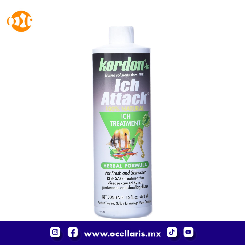 Kordon Ich-Attack® es un tratamiento fácil de usar compuesto por ingredientes orgánicos múltiples para todo tipo de infecciones unicelulares externas y epidérmicas. Su amplio espectro de actividad y la falta de toxicidad hacen que Ich-Attack sea efectivo sin requerir un diagnóstico específico. Evita que comiencen las invasiones parasitarias infecciosas internas y externas, además previene muchas infecciones secundarias. En resumen, Ich-Attack suprime y elimina un amplio espectro de infecciones. La acción terapéutica de Ich-Attack sobre protozoos y otras infecciones se debe a su unión con estructuras citoplasmáticas dentro de la célula de los organismos infectantes. Kordon Ich-Attack como un tratamiento a base de hierbas orgánicas se centra en su efectividad en el tratamiento de infecciones por protozoos, hongos y dinoflagelados. Puede ser un inhibidor, pero no un eliminador de virus infecciosos, bacterias y organismos multicelulares. Ich-Attack es compatible con otros productos herbales orgánicos de Kordon, como Rid-Fungus y Prevent Ich. Ich-Attack se puede usar con todos los acondicionadores de agua Kordon como NovAquas, AmQuels y Fish Protector, todos los clarificadores de agua Kordon. Hierbas orgánicas a base de naftoquinonas Para condiciones de acuarios y estanques de agua dulce y salada Ayuda a prevenir y tratar enfermedades externas de peces unicelulares Igualmente eficaz en agua dulce y salada Seguro para usar con invertebrados acuáticos. No afecta corales Hecho en EE.UU