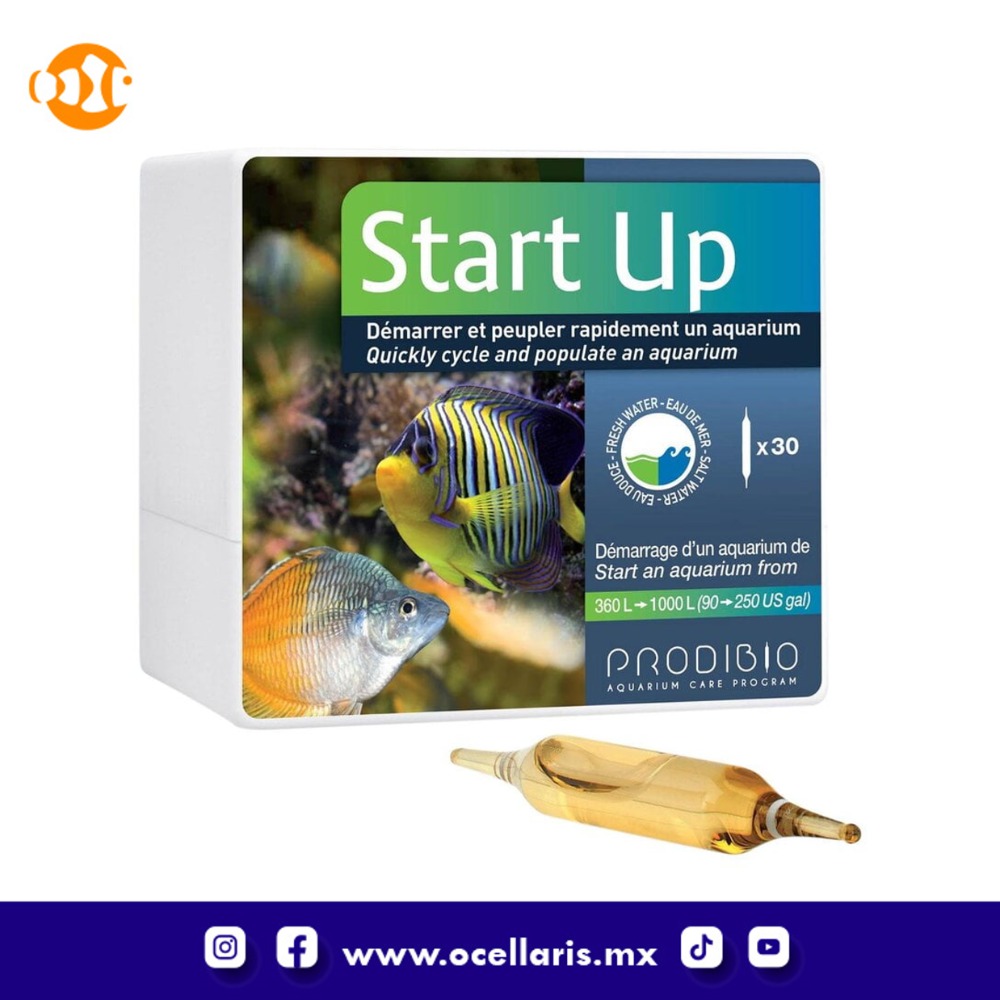 START UP - Kit de iniciación para acuarios de agua salada Tamaño recomendado del acuario 90-250 galones (30 Vials) El START UP de PRODIBIO permite un arranque rápido y seguro de su acuario de agua salada. Las bacterias vivas específicas contenidas en este kit (BIODIGEST START) se adaptan a las necesidades de un nuevo acuario, la combinación con un bloqueador de amoníaco natural (STOP AMMO START) promueve la estabilización rápida del ciclo de nitrógeno y protege eficazmente a sus nuevos residentes. Gama Nano: Blister de 2 o 4 viales de 1 ml. Gama estándar: Caja de 6, 12 o 30 viales de 1 ml. START UP de PRODIBIO reúne los productos BIODIGEST START y STOP AMMO START para optimizar el arranque del acuario marino. Este kit de siembra de bacterias vivas te permite iniciar un acuario de forma rápida y segura para peces e invertebrados. Nuestras bacterias útiles se ponen a trabajar inmediatamente al contacto con el oxígeno presente en el agua, sin demora ni necesidad de reactivación. START UP permite introducir rápidamente a los primeros habitantes en nuestro nuevo acuario: Después de 4 horas para acuarios de agua dulce Después de 12 horas para un acuario marino BIODIGEST START está compuesto por cepas bacterianas naturales nitrificantes, desnitrificantes y facultativas seleccionadas por su capacidad de iniciar muy rápidamente el ciclo del nitrógeno y con el fin de transformar el amoníaco en nitritos, los nitritos en nitratos y los nitratos en nitrógeno. Estas bacterias trabajan en equipo, y cada cepa completa el trabajo iniciado por las demás. STOP AMMO START es un producto a base de extractos vegetales específicos cuya principal propiedad es captar el nitrógeno del amoníaco y transformarlo en compuestos inocuos.