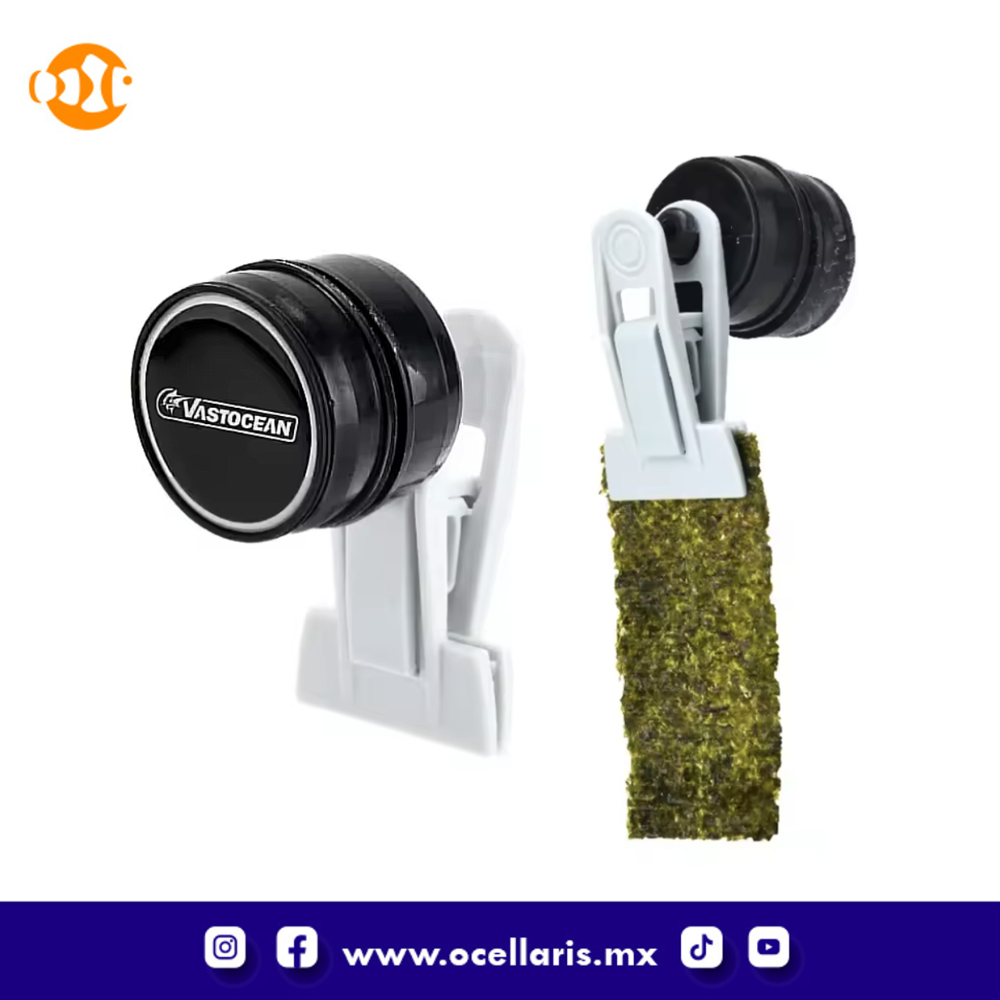 magnético fuerte para alimentación de algas marinas, clip para verduras, suministros para acuario, es perfecto para tus herbívoros. Alimenta facilmente, simplemente engánchalo, desliza el imán en su lugar, y esta listo. El imán funciona con vidrío o acrilico, se puede quitar para una fácil limpieza.